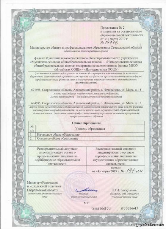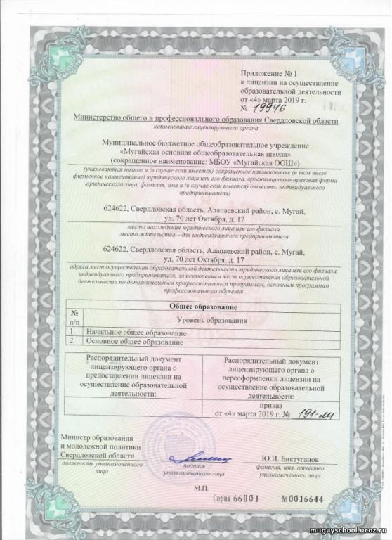 • Места осуществления образовательной деятельности по дополнительным образовательным программам: Свердловская область Алапаевский район, с.Мугай. ул.70 лет Октября, 17
